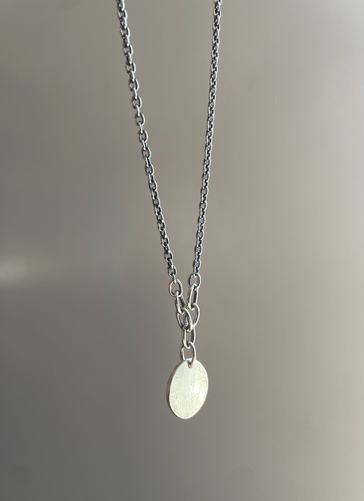 A different version of my Silver Medallion necklace, this time with a hand full of small handmade links connected it to the chain. The medallion is made from leftover silver scraps from other projects, I melted them down into and ingot, and then forged it into this perfectly imperfect medallion.