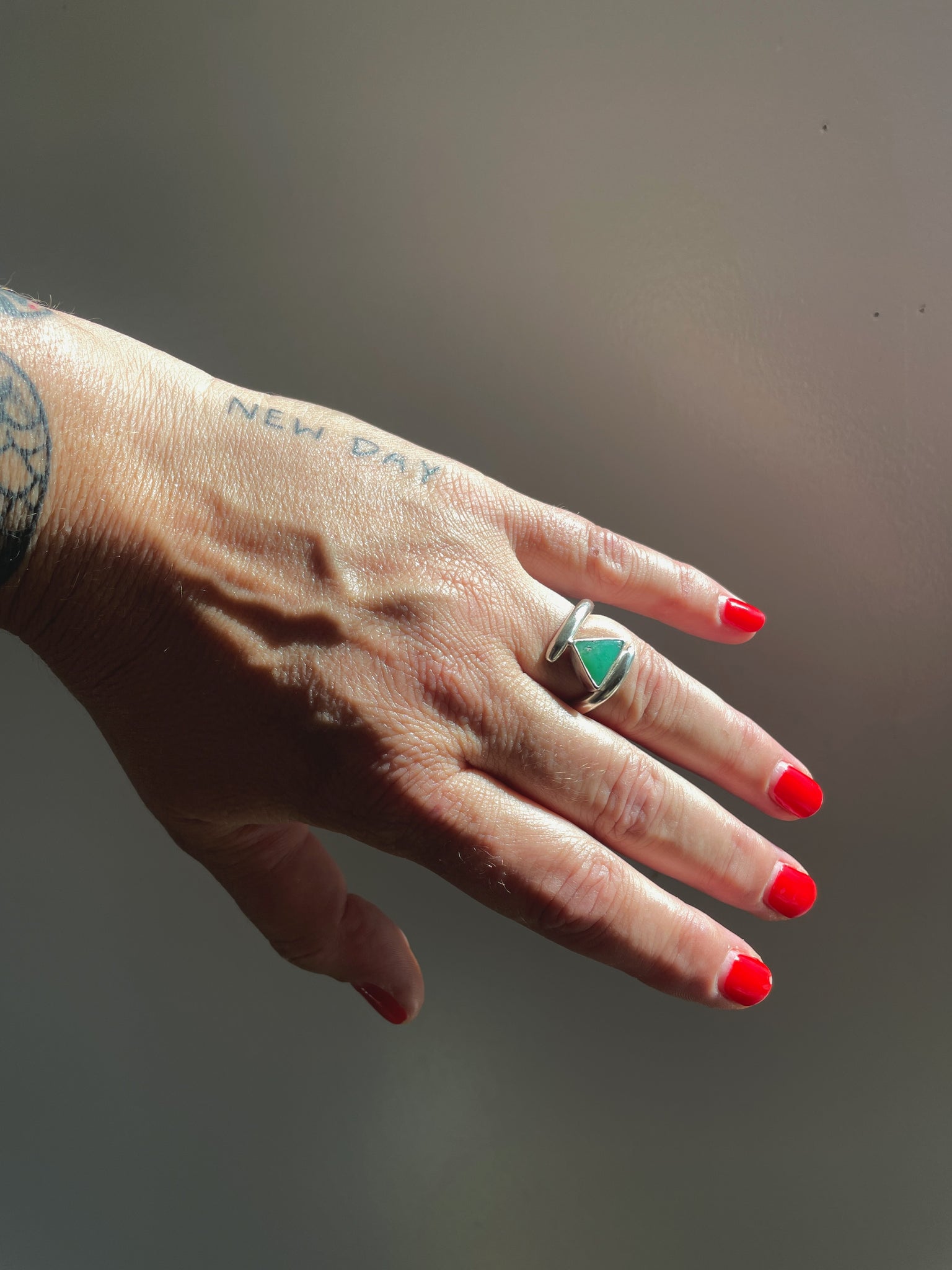 Heavy silver wrapped around a one of a kind piece Chrysoprase. I love how the triangular shape sits in the curves of the silver band, and that soft mellow green color of the stone.