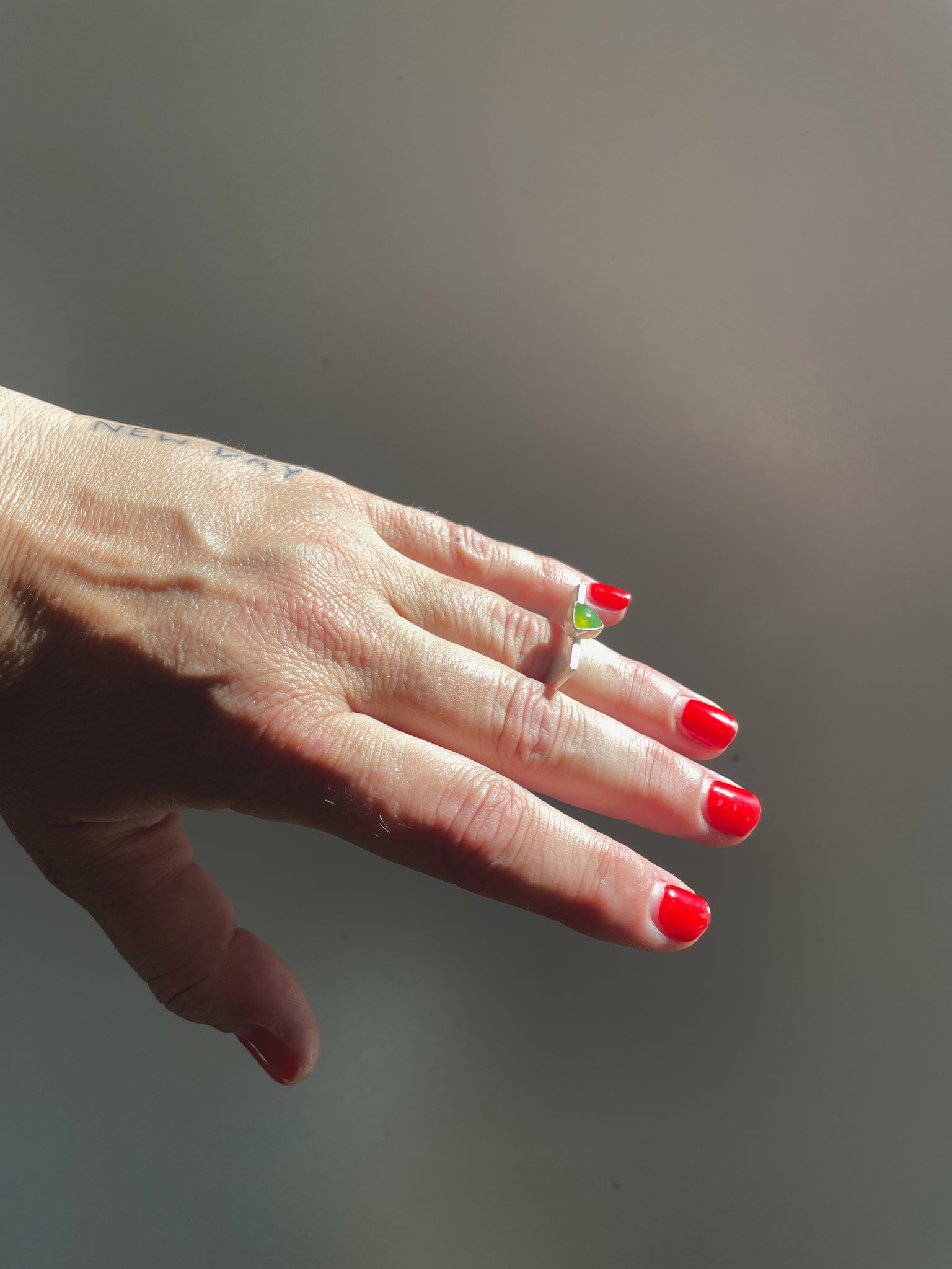 The Slice ring is a thick slab of silver, sawed, shaped, filed and formed by hand into this tall and sleek ring.  It has great weight to it and feels great on the finger.  The stone has the perfect juicy chartreuse/lime green color, with beautiful gem quality that makes it super vibrant.