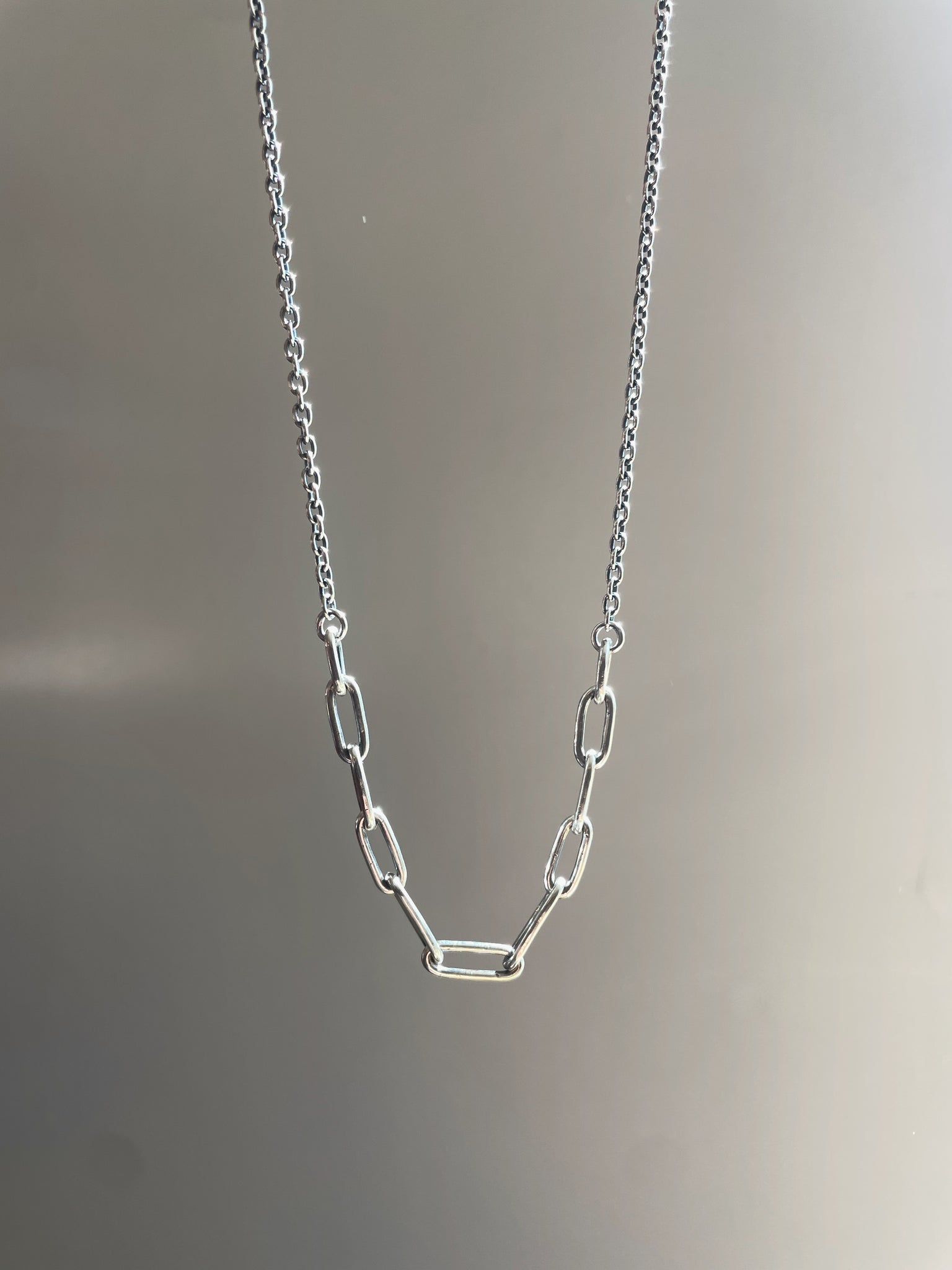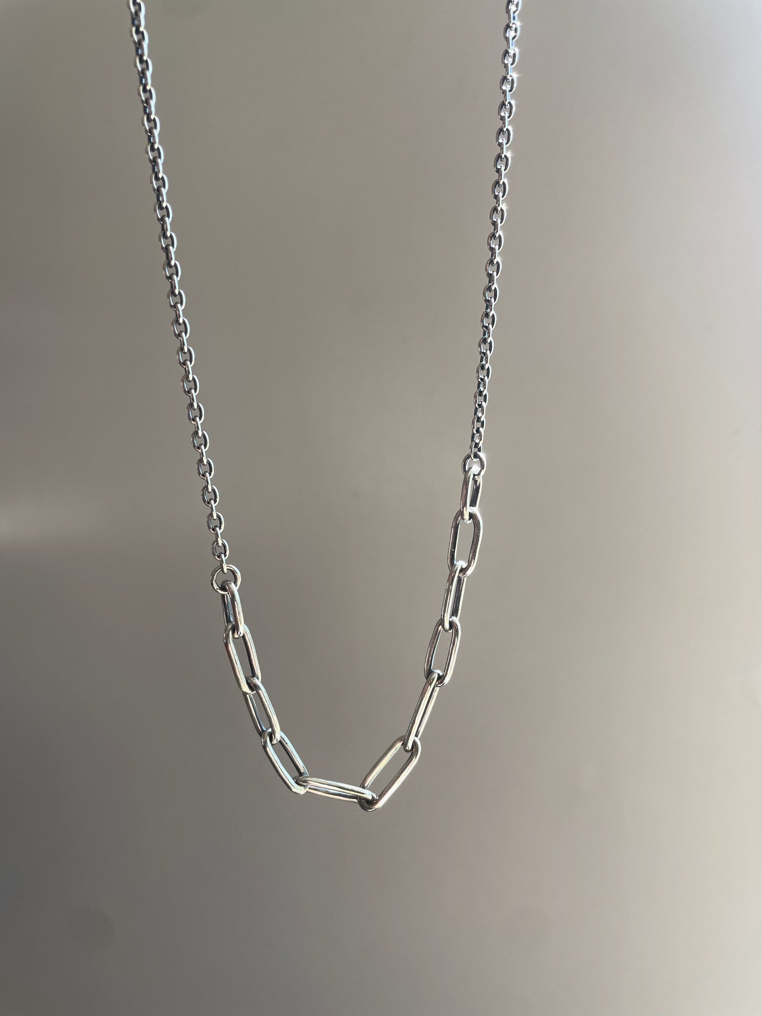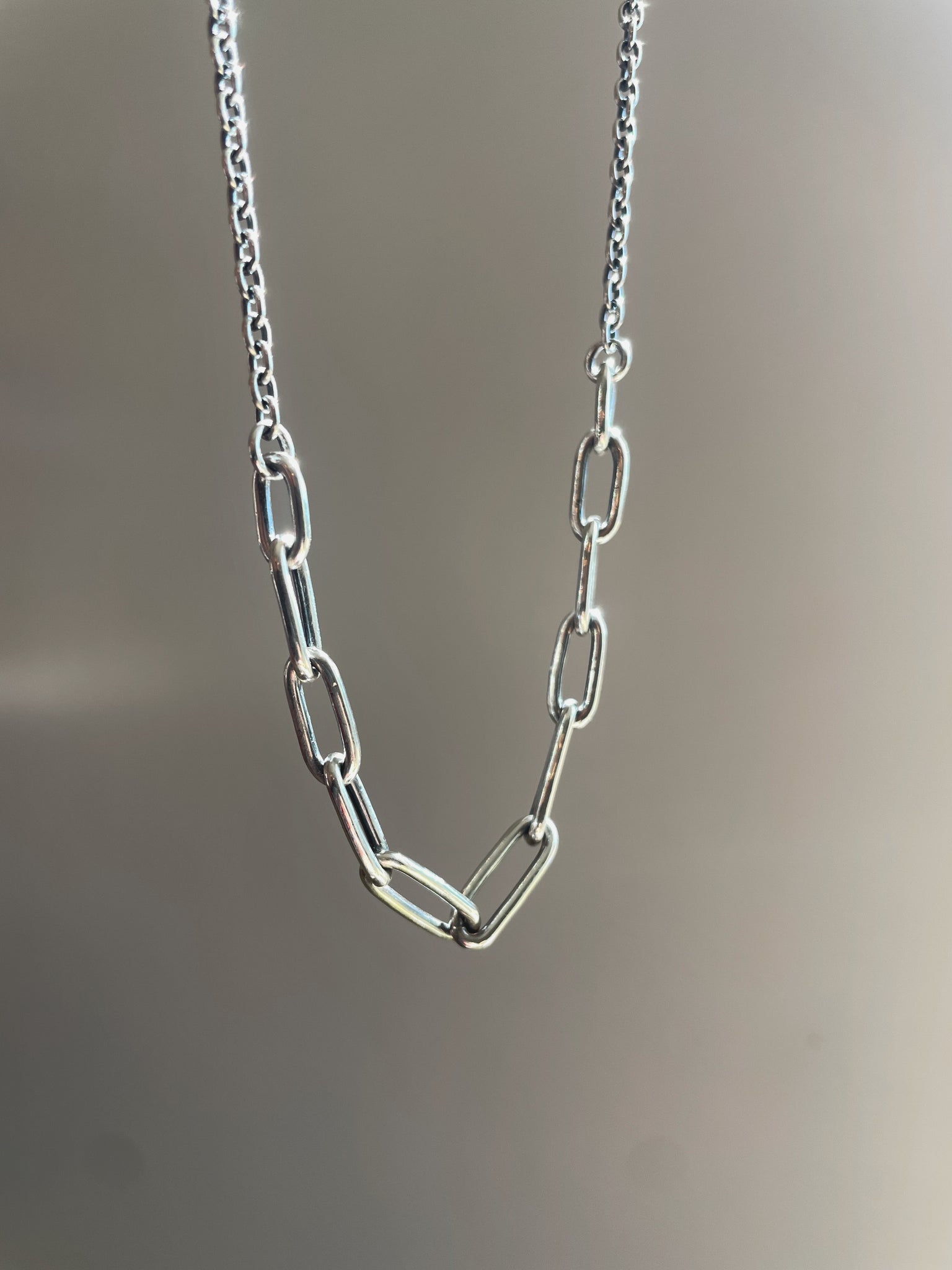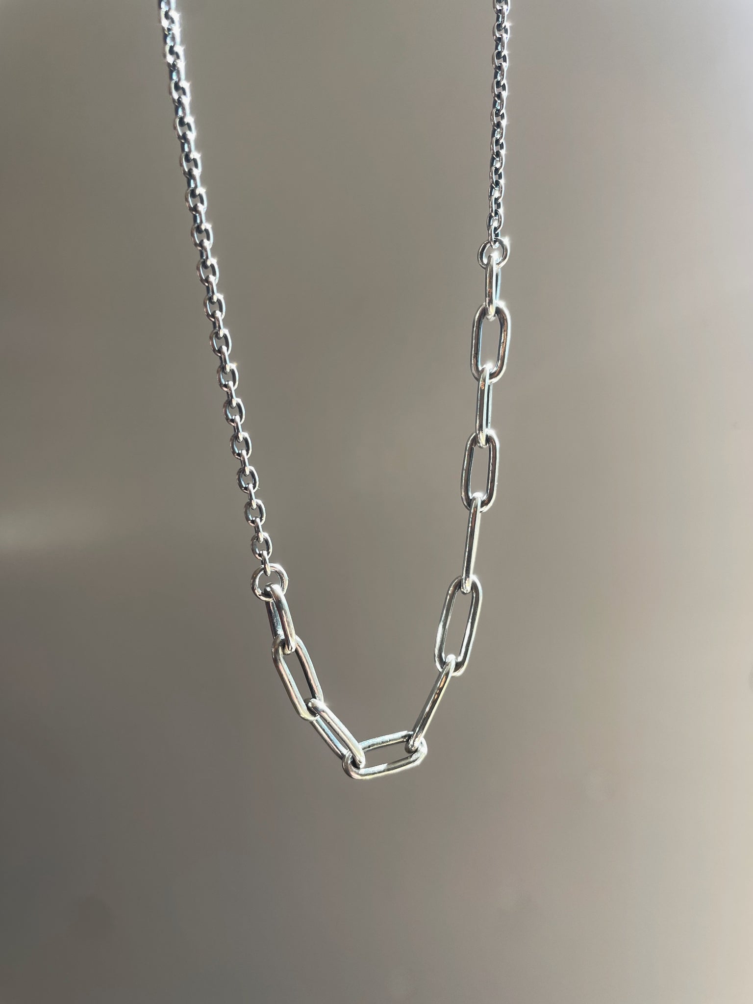 Handmade chain, built from sterling silver, each link formed, cut, shaped, soldered and finished to a perfectly imperfect texture. Paired with my favorite medium weight cable chain, and finished off with a handmade clasp. This piece has a nice weight to it, a perfect everyday necklace, that is just as good alone as it is mixed with your other favorites.